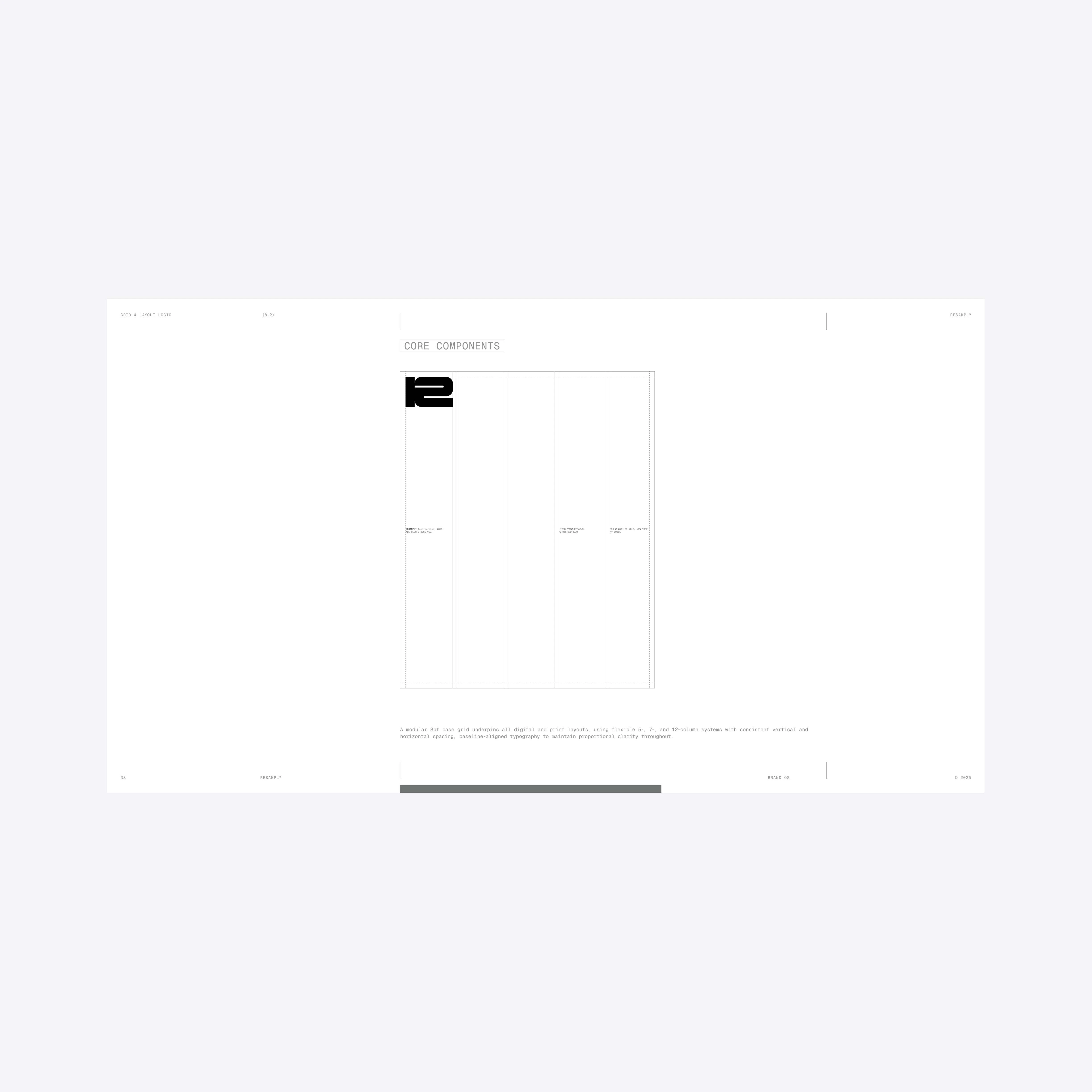 A modular Brand Operating System consisting of 48 system-driven pages for Adobe InDesign—featuring structured grid logic, typographic hierarchy, and a restrained visual framework, designed to support consistent, scalable brand identities across digital, print, and physical applications.